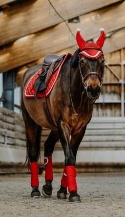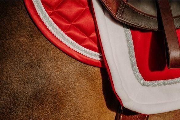 クリスマスの馬のコスプレ衣装にぴったりな、赤のベースにシルバーとホワイトのフリンジがキラキラ輝くゼッケンです。 表面はサテンのようなつるっとした生地感で、光沢があり、触り心地も非常になめらかです。 このゼッケンはポニーとホースの2サイズ展開でどちらのサイズでも馬の姿をより華やかに演出してくれます。 クリスマスパーティーや冬の引馬イベント、撮影など、特別な日に馬と一緒に華やかな雰囲気を演出したい時に最適です。 サイズはポニーとホースの2サイズです。 季節商品とため再入荷はありません。