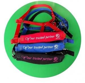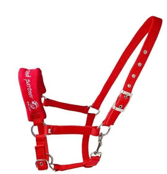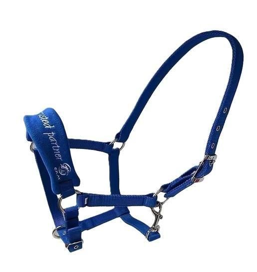 鼻革部分はやさしい幅広のフリースパットになっています。 色は明るいブルー、レッドにブラックです。 金具はステンレス製 鼻周りも調整可能なバックル付き サイズはコブとフル
